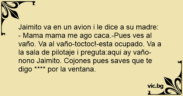 - Mama mama me ago саса.-Pues ves al vaño. Va al vaño-toctoc!-esta ocupado. Va a la sala de pilotaje i preguta:aqui ay vaño-nono Jaimito. Соjоnеs pues saves que te digo **** por la ventana.