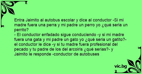 Entra Jaimito al autobus escolar y dice al conductor -Si mi madre fuera una perra y mi padre un реrrо yo ¿qué seria un perrito?