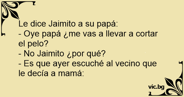 Le dice Jaimito a su papá:<br />- Oye papá ¿me vas a llevar a cortar el pelo?<br />- No Jaimito ¿por qué?<br />- Es que ayer escuché al vecino que le decía a mamá: