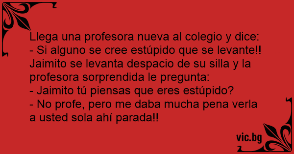 Skolotāja ienāk klasē: Kurš ir stulbs pieceļās! Jānītis pieceļās. Tu esi stulbs? Nē skolotāj, man vienkārši žēl, ka jūs viena pati stāvat!