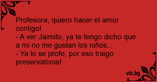 Jaimito le dice a su profesora: -Señorita, la deseo. La maestra se sorprende y le dice: -¿Qué cosas dices? A mí no me gustan los niños pequeños. - No se preocupe, tomaremos precauciones!