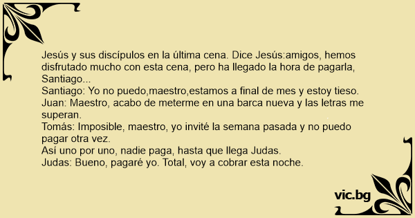 Пристига Исус на тайната вечеря, а там тече щур купон, всички ядат, пият и се забавляват, и никой не му обръща внимание...
