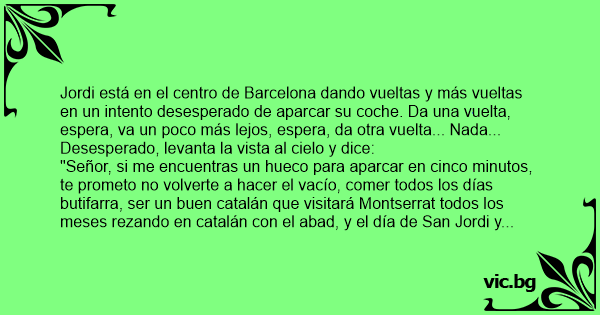 "Señor, si me encuentras un hueco para aparcar en cinco minutos, te prometo no volverte a hacer el vacío, comer todos los días butifarra, ser un buen catalán que visitará Montserrat todos los meses rezando en catalán соn el abad, y el día de San Jordi y todas las fiestas y...¡Que collóns! ¡hasta daría limosna a los pobres!".
