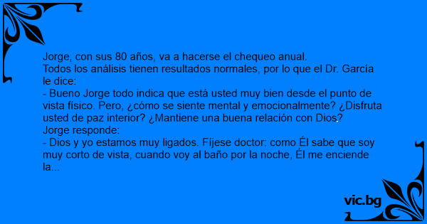 - Dios y yo estamos muy ligados. Fíjese doctor: como Él sabe que soy muy corto de vista, cuando voy al baño por la noche, Él me enciende la luz y, cuando termino, me la apaga.
