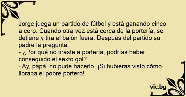 Jorge juega un partido de fútbol y está ganando cinco a cero. Cuando otra vez está cerca de la portería, se detiene y tira el balón fuera. Después del partido su padre le pregunta: