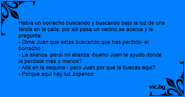 Había un borracho buscando y buscando bajo la luz de una farola en la calle, por alli pasa un vecino,se acerca y le pregunta: - Dime Juan que estas buscando,que has perdido- el borracho : - La alianza, perdí mi alianza -bueno Juan te ayudo,donde la perdiste mas o menos? - Allá en la esquina - pero Juan por qué la buscas aqui? - Porque aqui hay luz zopenco