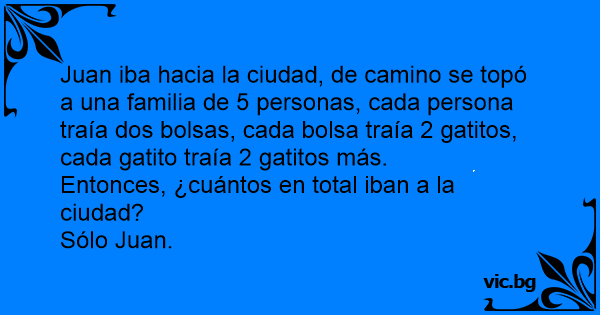 Juan iba hacia la ciudad, de camino se topó a una familia de 5 personas, cada persona traía dos bolsas, cada bolsa traía 2 gatitos, cada gatito traía 2 gatitos más.