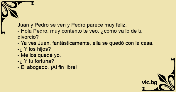 - Hola Pedro, muy contento te veo, ¿cómo va lo de tu divorcio?