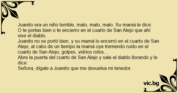 Juanito no se portó bien, y su mamá lo encerró en el cuarto de San Alejo, al cabo de un tiempo la mamá oye tremendo ruido en el cuarto de San Alejo, golpes, vidrios rotos...