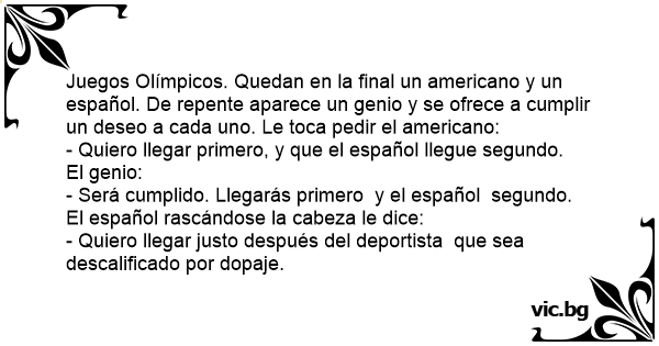 Juegos Olímpicos. Quedan en la final un americano y un español. De repente aparece un genio y se ofrece a cumplir un deseo a cada uno. Le toca pedir el americano: