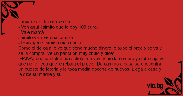 !HAIVA¡ que pantalon mas chulo me voy y me la compro y el de caja ve que no le llega que le rebaja el precio. De camino a casa se encuentra un puesto de loteria y le toca media docena de huеvоs. Llega a casa y le dice su madre y su padre:
