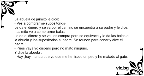 Le da el dinero y se va ,los compra pero se equivoca y le da las balas a la abuela y los supositorios al padre. Se reunen para cenar y dice el padre :