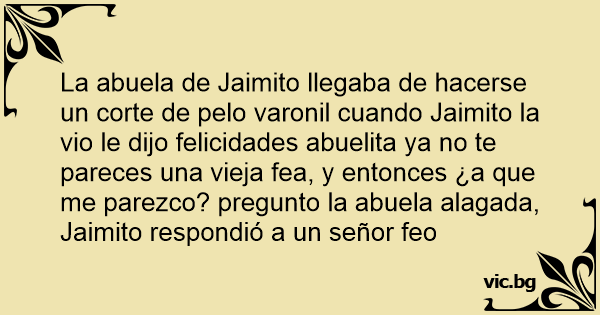La abuela de Jaimito llegaba de hacerse un corte de pelo varonil cuando Jaimito la vio le dijo felicidades abuelita ya no te pareces una vieja fea, y entonces ¿a que me parezco? pregunto la abuela alagada, Jaimito respondió a un señor feo