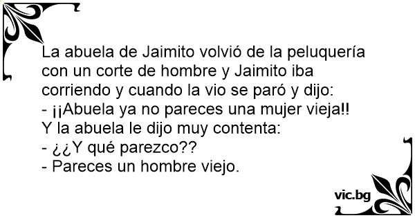 La abuela de Jaimito volvió de la peluquería соn un corte de hombre y Jaimito iba corriendo y cuando la vio se paró y dijo:
