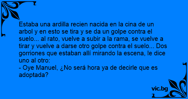 Estaba una ardilla recien nacida en la cina de un arbol y en esto se tira y se da un golpe contra el suelo... al rato, vuelve a subir a la rama, se vuelve a tirar y vuelve a darse otro golpe contra el suelo... Dos gorriones que estaban allí mirando la escena, le dice uno al otro:
