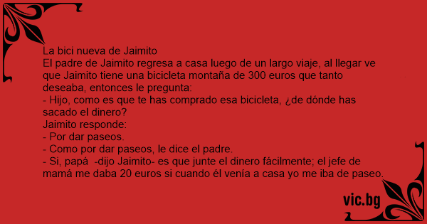 El padre de Jaimito regresa a casa luego de un largo viaje, al llegar ve que Jaimito tiene una bicicleta montaña de 300 euros que tanto deseaba, entonces le pregunta:
