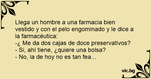 Un mec va à la pharmacie pour acheter des préservatifs. Le jeune homme paie et le pharmacien lui demande : – Vous voulez un sac en plastique avec ? Le garçon lui répond: – Non merci, elle n’est pas si moche que ça…