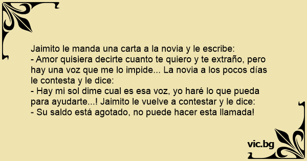 - Amor quisiera decirte cuanto te quiero y te extraño, pero hay una voz que me lo impide... La novia a los pocos días le contesta y le dice: