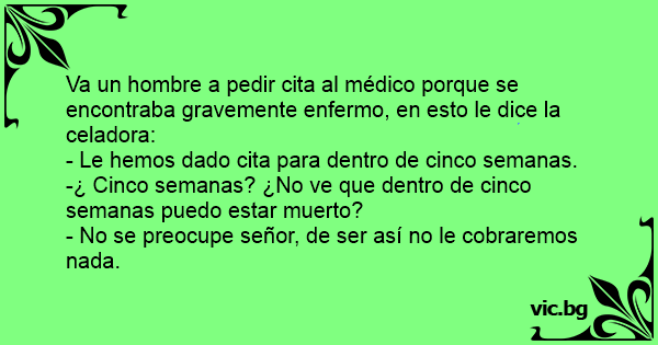 Va un hombre a pedir cita al médico porque se encontraba gravemente enfermo, en esto le dice la celadora: