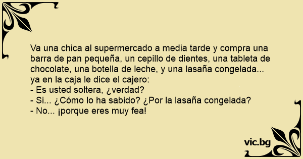 En pige lægger sine varer op ved kassen: 1 tomat, 1 lille pose kaffe, 1 frossen færdigret, 1 tærte, 1 müslibar og en frossen pizza! Manden ved kassen spørger smilende: – Single, hva? Pigen smiler...