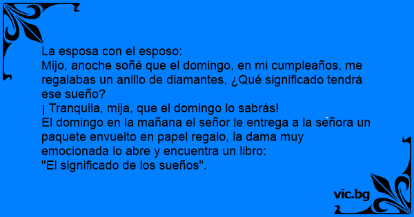 El domingo en la mañana el señor le entrega a la señora un paquete envuelto en papel regalo, la dama muy emocionada lo abre y encuentra un libro: