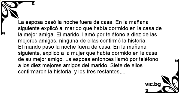 La esposa pasó la noche fuera de casa. En la mañana siguiente explicó al marido que había dormido en la casa de la mejor amiga. El marido, llamó por teléfono a diez de las mejores amigas, ninguna de ellas confirmó la historia.