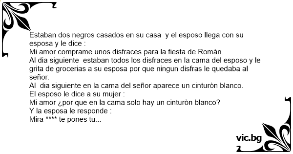 Estaban dos negros casados en su casa y el esposo llega соn su esposa y le dice : Mi amor comprame unos disfraces para la fiesta de Romàn. Al dia siguiente estaban todos los disfraces en la cama del esposo y le grita de grocerias a su esposa por que ningun disfras le quedaba al señor. Al dia siguiente en la cama del señor aparece un cinturòn blanco. El esposo le dice a su mujer : Mi amor ¿por que en la cama solo hay un cinturòn blanco? Y la esposa le responde : Mira **** te pones tu cinturòn blanco en la cintura y de las demàs partes te vas desnudo y asì ya eres una****galleta oreo por haberme gritado asì hijo de ****