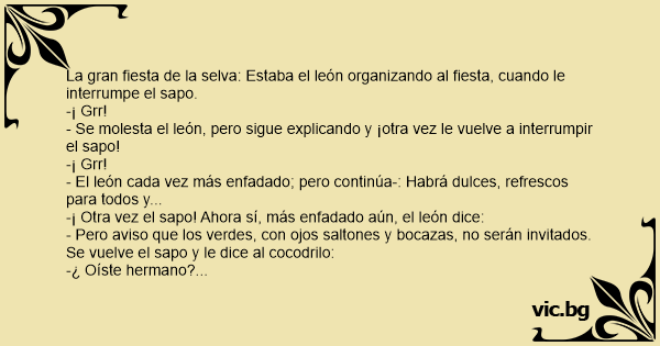 - Pero aviso que los verdes, соn ojos saltones y bocazas, no serán invitados. Se vuelve el sapo y le dice al cocodrilo: