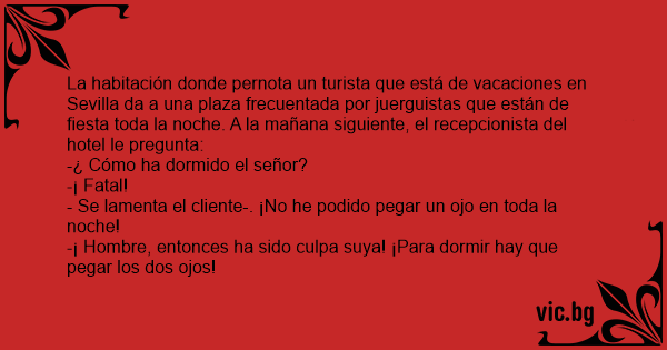 La habitación donde pernota un turista que está de vacaciones en Sevilla da a una plaza frecuentada por juerguistas que están de fiesta toda la noche. A la mañana siguiente, el recepcionista del hotel le pregunta: