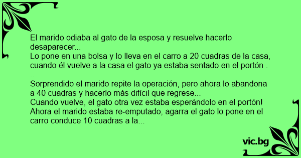 Ahora el marido estaba re-emputado, agarra el gato lo pone en el carro conduce 10 cuadras a la derecha, 22 al sur, 14 al este, 20 a la izquierda, cruza un par de autopistas, un puente y luego hacia el norte y le dice: