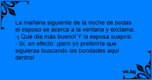 La mañana siguiente de la noche de bodas el esposo se acerca a la ventana y exclama: