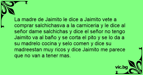 La madre de Jaimito le dice a Jaimito vete a comprar salchichasva a la carniceria y le dice al señor dame salchichas y dice el señor no tengo Jaimito va al baño y se corta el pito y se lo da a su madrelo cocina y selo comen y dice su madreestan muy ricos y dice Jaimito me parece que no van a tener mas.