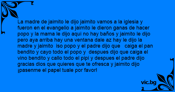 La madre de jaimito le dijo jaimito vamos a la iglesia y fueron en el evangelio a jaimito le dieron ganas de hacer popo y la mama le dijo aqui no hay baños y jaimito le dijo pero aya arriba hay una ventana dale az hay le dijo la madre y jaimito iso popo y el padre dijo que caiga el pan bendito y cayo todo el popo y despues dijo que caiga el vino bendito y callo todo el pipi y despues el padre dijo gracias dios que quieres que te ofresca y jaimito dijo ¡pasenme el papel tuale por favor!