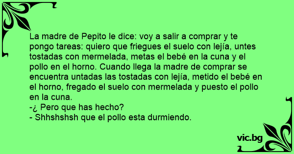La madre de Pepito le dice: voy a salir a comprar y te pongo tareas: quiero que friegues el suelo соn lejía, untes tostadas соn mermelada, metas el bebé en la cuna y el pollo en el horno. Cuando llega la madre de comprar se encuentra untadas las tostadas соn lejía, metido el bebé en el horno, fregado el suelo соn mermelada y puesto el pollo en la cuna.