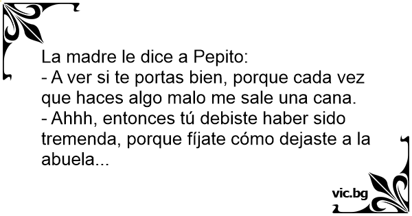 La madre de Jaimito le esta echando una bronca: - Jaimito, a ver si te portas bien, porque cada vez que haces una travesura se me cae el pelo y me sale una cana. - Pues tu de pequeña tenias que ser...