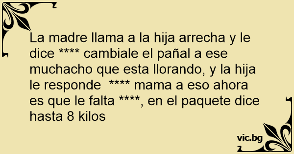 La madre llama a la hija arrecha y le dice **** cambiale el pañal a ese muchacho que esta llorando, y la hija le responde **** mama a eso ahora es que le falta ****, en el paquete dice hasta 8 kilos