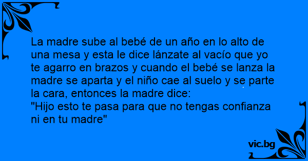 La madre sube al bebé de un año en lo alto de una mesa y esta le dice lánzate al vacío que yo te agarro en brazos y cuando el bebé se lanza la madre se aparta y el niño cae al suelo y se parte la cara, entonces la madre dice: