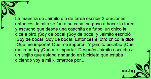La maestra de Jaimito dio de tarea escribir 3 oraciones, entonces Jaimito se fue a su casa, se puso a hacer la tarea y escucho que desde una canchita de fútbol un chico le dice a otro ¡Soy de boca! ¡Soy de boca! y Jaimito escribió ¡Soy de boca! ¡Soy de boca!. Entonces el otro chico le dice ¡Qué me importa!¡Qué me importa!. Y jaimito escribió ¡Qué me importa¡ ¡Qué me importa!. Después Jaimito escucho a un viejito que estaba andando en bicicleta que estaba diciendo voy a mil kilómetros por hоrа. Entonces Jaimito escribió voy a mil kilómetros por hоrа. Al otro día Jaimito fue al colegio y la maestra le dijo haber Jaimito que escribiste y Jaimito dice ¡Soy de boca! ¡Soy de boca! (como la maestra era de River dijo) si vuelves a decir eso te pego una patada que vas a salir volando entones dijo ¡Qué me importa!, ¡Qué me importa!, la maestra le pegó y salió volando (y en el aire dijo) voy a mil kilómetros por hоrа.
