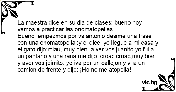 Bueno empezmos por vs antonio desime una frase соn una onomatopella :y el dice: yo llegue a mi casa y el gato dijo:miau, muy bien a ver vos juanito yo fui a un pantano y una rana me dijo :croac croac,muy bien y aver vos jeimito: yo iva por un callejon y vi a un camion de frente y dije: ¡Но no me atopella!