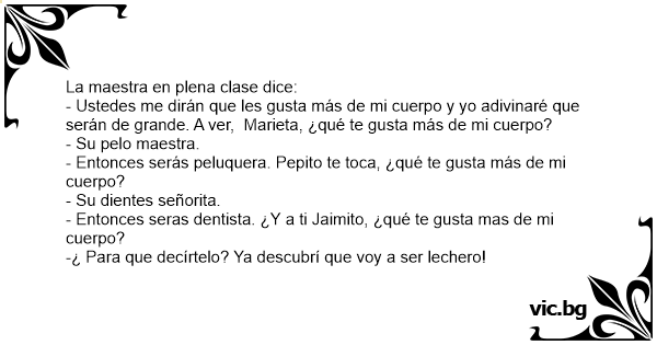- Ustedes me dirán que les gusta más de mi cuerpo y yo adivinaré que serán de grande. A ver, Marieta, ¿qué te gusta más de mi cuerpo?