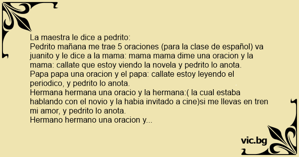Pedrito mañana me trae 5 oraciones (para la clase de español) va juanito y le dice a la mama: mama mama dime una oracion y la mama: callate que estoy viendo la novela y pedrito lo anota.