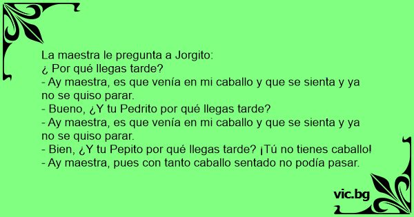- Bien, ¿Y tu Pepito por qué llegas tarde? ¡Tú no tienes caballo!