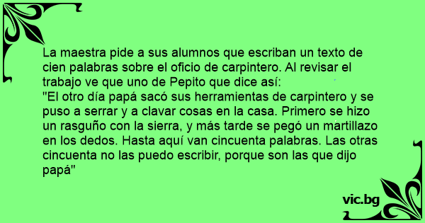 La maestra pide a sus alumnos que escriban un texto de cien palabras sobre el oficio de carpintero. Al revisar el trabajo ve que uno de Pepito que dice así: