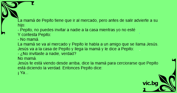 La mamá se va al mercado y Pepito le habla a un amigo que se llama Jesús. Jesús va a la casa de Pepito y llega la mamá y le dice a Pepito: