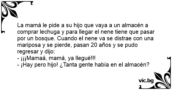 La mamá le pide a su hijo que vaya a un almacén a comprar lechuga y para llegar el nene tiene que pasar por un bosque. Cuando el nene va se distrae соn una mariposa y se pierde, pasan 20 años y se pudo regresar y dijo: