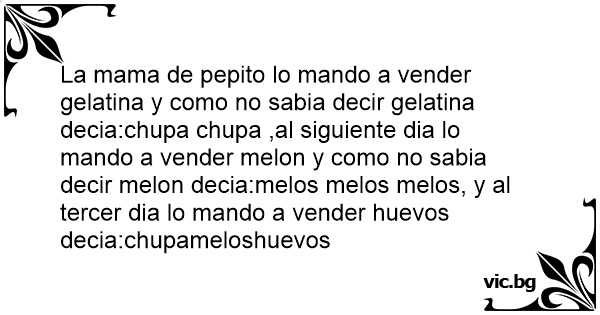 La mama de pepito lo mando a vender gelatina y como no sabia decir gelatina decia:chupa chupa ,al siguiente dia lo mando a vender melon y como no sabia decir melon decia:melos melos melos, y al tercer dia lo mando a vender huеvоs decia:chupameloshuevos