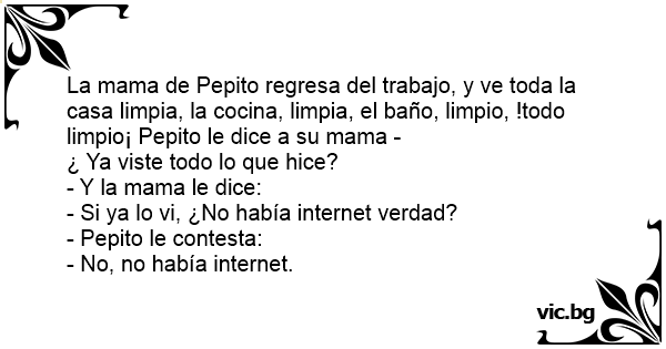 La mama de Pepito regresa del trabajo, y ve toda la casa limpia, la cocina, limpia, el baño, limpio, !todo limpio¡ Pepito le dice a su mama -
