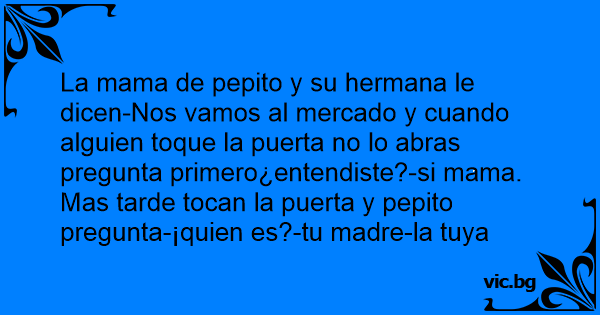 La mama de pepito y su hermana le dicen-Nos vamos al mercado y cuando alguien toque la puerta no lo abras pregunta primero¿entendiste?-si mama. Mas tarde tocan la puerta y pepito pregunta-¡quien es?-tu madre-la tuya