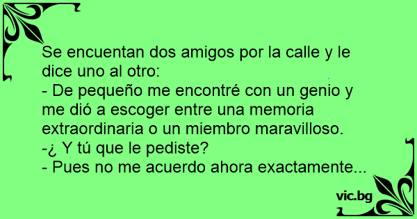 - Una vez un genio me dio a elegir entre quitarme el Alzheimer o tener el pene más grande. - ¿Y qué elegiste abuelo? - ¿Qué elegí de qué?