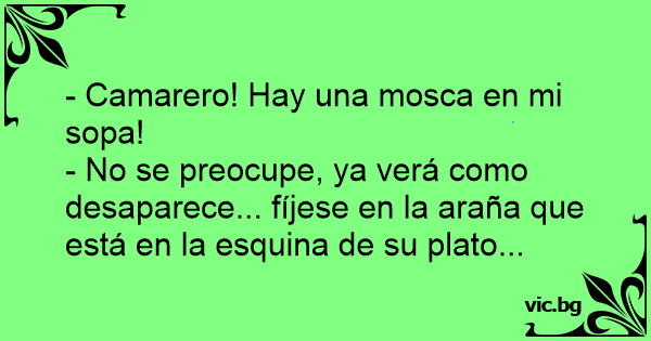 En un restaurante el cliente le dice al mesero: Mesero, ¡Hay una mosca en mi sopa! El mesero le responde: No se preocupe señor, la araña que está en su pan se ocupará de ella.